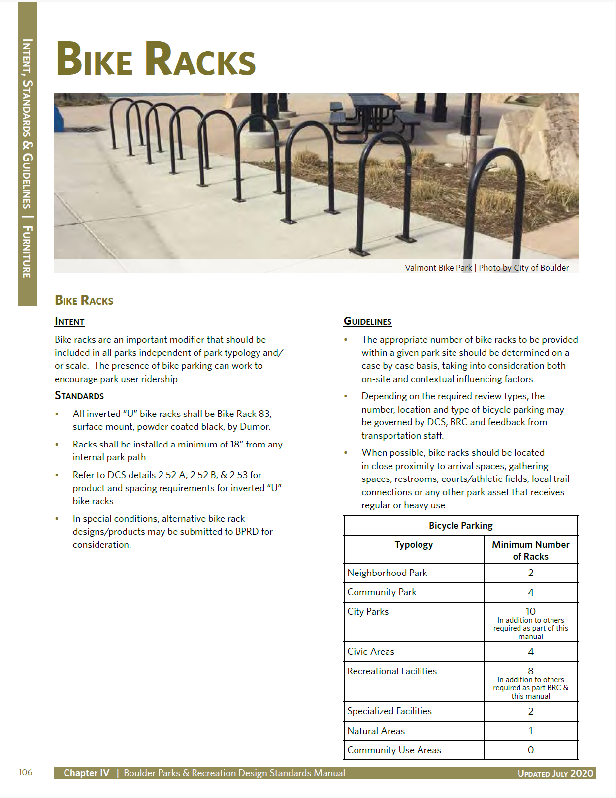 It’s based on generally accepted best practice, including the Association of Pedestrian and Bicycle and Professionals’ (APBP) Bicycle Parking Guidelines (2010), National Association of City Transportation Officials’ (NACTO) Urban Bikeway Design Guide (2014 and 2025 editions), and enacted municipal code as well as Design and Construction Standards (DCS) of the City of Boulder, Colorado.